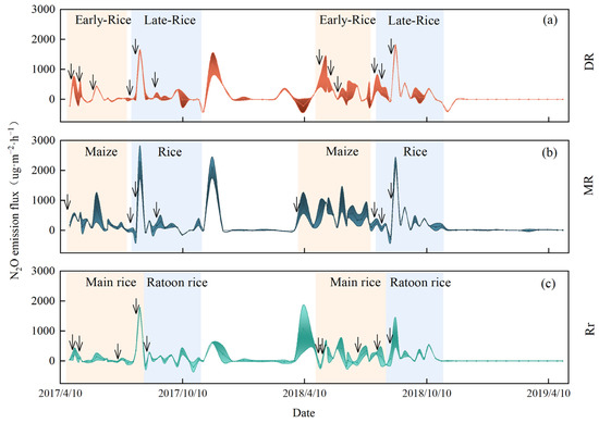 Average daily N2O flux (n = 3) of three different cropping systems from 2017 to 2018: (a) DR: double-cropping rice; (b) MR: maize rice; (c) Rr: ratooning rice. The arrows indicate the time of N fertilizer application in the different cropping systems. The shaded part represents the standard deviations of the means.