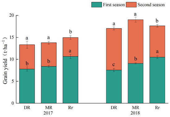 In a two-year experiment, the highest yield was observed in Rr during the first growing season, and it was significantly higher than MR and DR by 21.08% and 37.81%, respectively (Figure 4). There was no significant difference between DR and MR during the second growing season, and these were significantly higher than Rr. In general, the annual crop yields of DR, MR and Rr were higher in 2018 than in 2017, which may be due to the difference in climate. Compared with DR, the annual yield of MR and Rr was significantly higher by 8.06% and 7.30%, respectively.