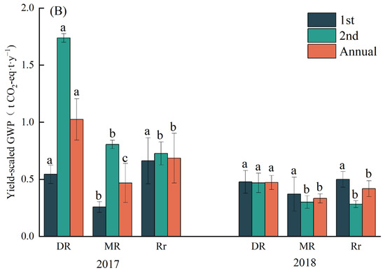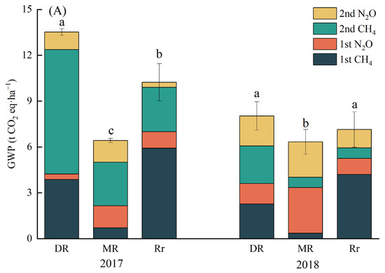 The average GWP calculated for the different cropping systems is shown in (Figure 5A). The CH4 emissions during the rice season contributed 71.83% to the seasonal GWP, and a higher GWP was observed in 2017 than in 2018. Compared to DR, the annual GWP decreased by 40.81% and 26.59% for MR and Rr, respectively.
