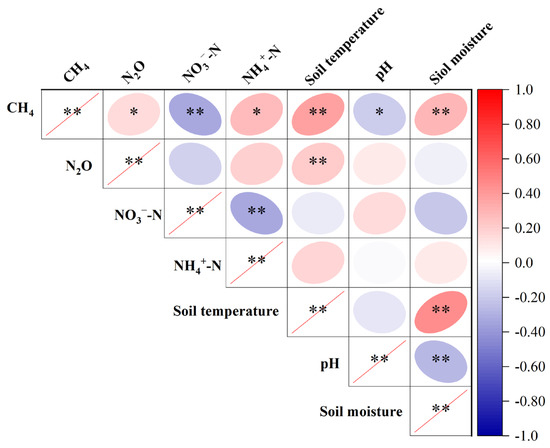 Correlation analysis of different factors with respect to CH4 and N2O (* p < 0.05, ** p < 0.01).