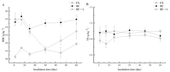 The content of SOC (A), TN (B), AN (C), −N (D), MBN (E) and pH value (F) during the 60-day incubation period in various treatments. CK, blank control; BC, biochar application; and BC + L, biochar and tea plant litter application. The vertical bars indicate standard errors. Each treatment contained three replicates.