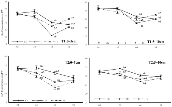 As shown in Figure 1, after capping operation, the concentration of IAA at plant apex first decreased and became lower than that of CK, then increased to even higher than that of CK at T1. At T1, IAA concentration among the two treatments and CK showed significant or extremely significant differences from day 6 and remained different at day 9. At T2, significant differences were observed from day 3 and expanded on day 6, and then the gap began to narrow to no significant differences at day 9. At the same time, the IAA concentration of the samples at 0–5 cm changed dramatically, and the concentration of capping agent treatment remained lower than that of DPC treatment. For the samples at 5–10 cm, IAA concentration changed gently and the curves of the two treatments crossed.