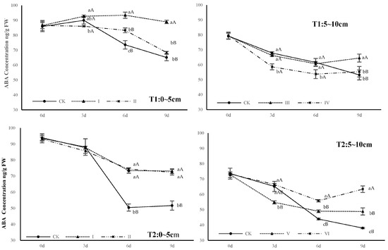 As shown in Figure 2, after capping operation, ABA concentration in 0~5 cm samples of two treatments increased from day 3, reaching a significant difference from CK on day 6. The ABA concentration of 5~10 cm samples kept lower, especially at T1, which reached significantly higher from that of CK at day 9. At the same time, except for 5~10 cm samples at T2, ABA concentration of samples treated with capping agent was higher than that treated with DPC in the other 3 groups.