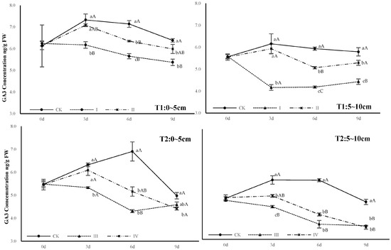 As shown in Figure 3, after capping treatment, GA3 concentration was lower than that of CK, and that of CA treatment was lower than that of DPC treatment, and the differences were significantly or extremely significantly different from day 3. The differences of GA3 concentration among CK and two treatments remained remarkable in T1, but narrowed in T2.