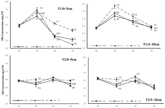 As shown in Figure 4, ZR concentration changed differently in the two periods: In the T1 period, it increased rapidly and then decreased, while that of DPC treatment was significantly higher than that of CA treatment and CK. In the T2 period, the ZR concentration of CK and CA treatment fluctuated and the change range was small, while that of DPC treatment was relatively high and maintained a stable downward trend.