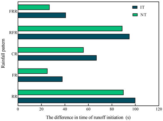 The difference in time of runoff initiation under different rainfall patterns. Note: IT means intensive tillage treatment; NT means no-tillage treatment.