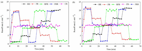 As shown in Figure 4, the surface runoff rate for the two tillage treatments had a similar trend under different rainfall patterns. The change in the trend of the surface runoff rate in each stage of the rainfall pattern was consistent with that of the rainfall intensity for the different rainfall patterns, yet the surface runoff rate under the NT first increased sharply and then stabilized gradually as the rainfall duration increased. Lower runoff rates were found in the RFR patterns than in the other rainfall patterns for the two treatments. Figure 4 also shows the peak runoff rates for the different rainfall patterns, which were statistically 1.55 to 1.60 and 1.67 to 1.78 times greater than the peak runoff rate under the CR pattern for the NT and IT, respectively. Regardless of tillage intensity, the study found that the peak runoff rates during rainfall with varying intensities were significantly higher than those observed during storms with a constant intensity. These results suggest that the process of runoff occurrence was not only affected by rainfall pattern but also was influenced by tillage intensity on the slope.