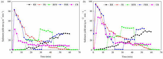 Figure 5 illustrates the temporal changes in sediment yield rates under the different rainfall patterns. Generally, the sediment yield rates exhibit changes based on the rainfall intensity during the rainfall event. The temporal trend of sediment yield varied significantly across all rainfall patterns and tillage intensities. For the CR pattern, the sediment yield rate for both the IT and NT increased sharply at the beginning and then decreased gradually, remaining stable until the end of the rainfall event. However, for the other four rainfall patterns, the sediment yield rates were inconsistent at different stages, despite having the same average rainfall intensity per storm. The sediment yield rates for the IT ranged from 1.41 to 21.42 L min−1, 2.61 to 21.40 L min−1, 0.05 to 20.69 L min−1, 1.68 to 22.04 L min−1, and 1.63 to 12.40 L min−1 for the RR, FR, RFR, FRR, and CR patterns, respectively. A similar range of sediment yield rates was observed in the different rainfall patterns for the NT. Compared to that for the NT, the mean sediment yield rates for the IT increased by 8.34–16.21%, with an average of 11.59% under different rainfall patterns. These findings suggest that the sediment yield rate displayed a rapid and obvious response to rainfall patterns and tillage intensities.