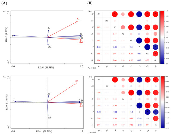 (A) Redundancy analysis (RDA) and (B) Correlation matrix for rainfall intensity (RI), rainfall stage (RS), V, Re, Fr, f, surface runoff (RA), and sediment yield (SL); The numbers 1 and 2 represent the NT and IT, respectively. Variance percentages explained by the RDA axes are indicated in parentheses.