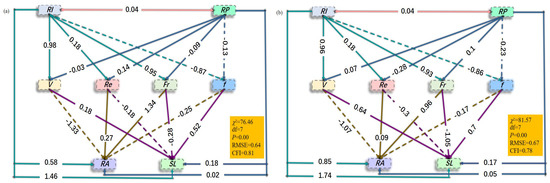 Structural equation model (SEM) showing the effects of rainfall intensity (RI) and rainfall pattern (RP) on surface runoff (RA) and sediment yield (SL); (a) NT and (b) IT. Solid and dashed lines show positive and negative correlations, respectively. Numbers beside arrows indicate standardized coefficients.