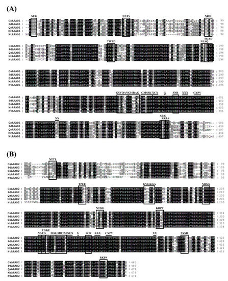 The CsARADs sequences were cloned from the Sijichun tea plant. These nucleic acid sequences were then submitted to the GenBank repository with accession numbers ON234110 and ON234111. For CsARAD1 and CsARAD2, the full lengths of their cDNA sequences were 1705 and 1637 bp, respectively, and their untranslated regions were 78 and 116 bp, respectively. The open reading frames of CsARAD1 and CsARAD2 included 1503 and 1443 nucleotide sequences, which encode 500 and 480 amino acid sequences, respectively (Figure S2).
