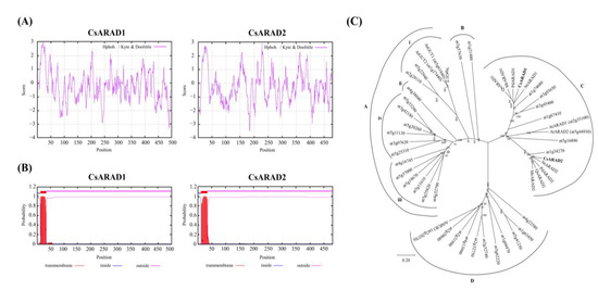 The molecular weights and isoelectric points of CsARAD1 and CsARAD2 were analyzed by compute pI/Mw with the values of 9.17 (molecular weight of CsARAD1), 8.52 (molecular weight of CsARAD2), 57.07 (isoelectric point of CsARAD1), and 54.23 kDa (isoelectric point of CsARAD2), respectively. Amino acid compositions were analyzed using ProtParam. CsARAD1 was 10.4% leucine, 9.6% serine, 6.4% isoleucine, 6.2% alanine, 6.2% arginine, and 6.2% valine; CsARAD2 was 10.6% leucine, 9.4% serine, 7.3% valine, and 6.5% proline (Table 1). ExPASy-ProtScale was used to calculate the hydropathic index of the proteins in the Hphob/Kyte and Doolittle mode. The proteins of both CsARAD1 and CsARAD2 had hydrophobic ends at the N-terminus. Transmembrane protein regions were predicted using TMHMM Server v. 2.0, and the results indicated that the transmembrane regions of CsARAD1 and CsARAD2 proteins were located between the 12th and 34th amino acid sites (Figure 2A,B). Based on the prediction results for the hydropathic index and transmembrane protein region, CsARAD1 and CsARAD2 proteins were determined to have a hydrophobic end and a transmembrane region at the N-terminus. Therefore, the two proteins were inferred to be type II membrane proteins. Furthermore, CsARAD1 and CsARAD2 were also predicted to be with no signaling peptides and were speculated to be located in the Golgi bodies by the utilization of SignalP 5.0 and DeepLoc 1.0 (Table S2).