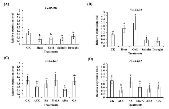 Transcript levels of CsARADs under abiotic stresses and hormones treatment. (A,B) Expression level of CsARADs in tea seedlings under various abiotic stresses. (C,D) Regulation of CsARAD1 and CsARAD2 in tea seedlings treated with various hormones. Transcript levels of CsARADs in buds were analyzed through qRT-PCR. Relative expression levels were calculated using 18S rRNA as an internal control. The values represent the average ± SE of at least three independent experiments. SAS software version 9.4 was used to perform Duncan’s operation analysis; letters represent significant differences between samples (p < 0.05). Abbreviations: Control check, CK; 1-aminocyclopropane-1-carboxylic acid, ACC; salicylic acid, SA; methyl jasmonate, MeJA; abscisic acid, ABA; gibberellin acid, GA.