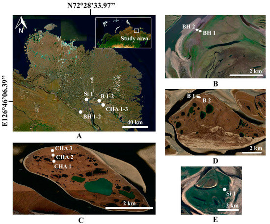 The study area. (A)—the Lena River delta; (B)—Byor-Chaya isl.; (C)—Chay-Ary isl.; (D)—Botulo-Sise isl.; (E)—Shrub isl.