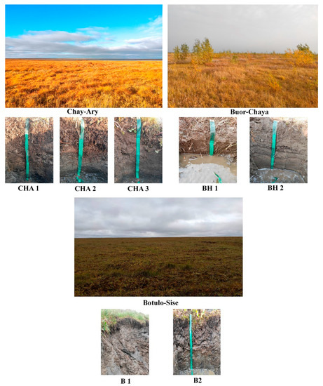 The studied soils are formed in relatively young areas of the Lena River delta (Chay-Ary isl., Buor-Chaya isl., and Shrub isl.); the represented islands have relatively recently escaped the flooding process and are formed under conditions of zonal processes (cryogenesis, peat formation, and peat accumulation). Samples from the islands Chay-Ary, Byor-Chaya, and Shrub were taken from all soil horizons. Botulo–Sise Island is a remnant of the Yedoma, samples for analysis were taken from melted areas of the Yedoma (B1), and a B2 sample was also taken as a background sample for the region. Soil samples were collected in plastic bags and frozen. The description of the studied soils is presented in Table 1.