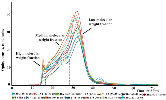 MW distribution parameters of HAs extracted from soils and sediments of Yedoma were obtained by size-exclusion chromatography. Three clusters of molecular fraction distribution were distinguished on the obtained spectra: high MW region, medium MW, and low MW (Figure 3). The areas belonging to the different fractions have different areas, which confirms the HA distribution in the three regions.