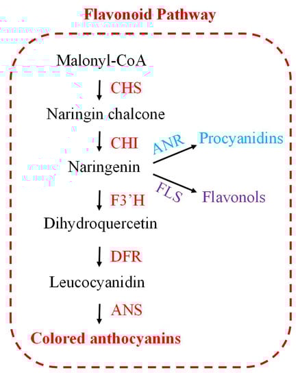 During the last few decades, the flavonoid biosynthesis enzymes have been studied in a number of plants, including snapdragon (Antirrhinum majus) [9], petunia (Petunia hybrida) [10], Eupatorium adenophorum [11], and Arabidopsis thaliana [12]. Chalcone synthase (CHS, EC 2.3.1.74) is an enzyme that plays a key role in flavonoid biosynthesis (Figure 1). Specifically, it catalyzes three malonyl-CoA molecules and one p-coumaroyl-CoA molecule (from the phenylpropane pathway) to synthesize naringin chalcone [13,14]. Naringin chalcone is subsequently converted to colored anthocyanins by the catalytic functions of a methyltransferase (MTs), anthocyanidin synthase (ANS), chalcone isomerase (CHI), dihydroflavonol 4-reductase (DFR), flavonoid 3′-hydroxylase (F3′H), and flavonoid 3-O-glucosyltransferase (3GT) [15]. Flavonol synthase (FLS) and anthocyanin reductase (ANR) mediate the branching of the flavonoid pathway for the distinct formation of flavonols and procyanidins [16,17] (Figure 1).