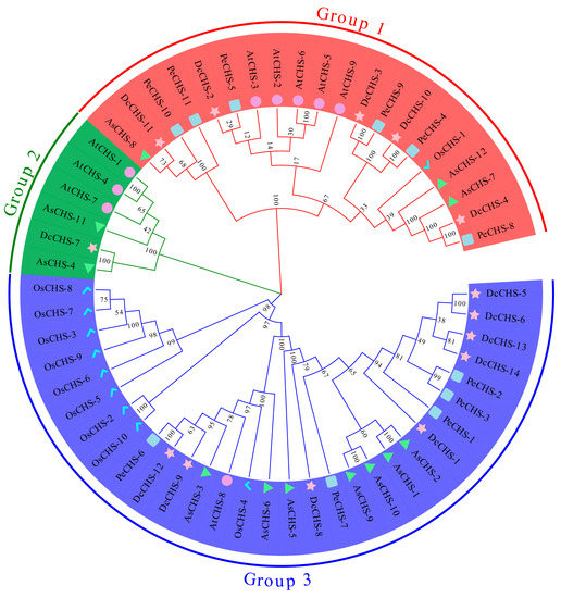 Phylogenetic analyses of CHS proteins. MEGA-X with default parameters was used to construct a phylogenetic tree of CHS proteins. The three groups are shown in different colors. Pink stars indicate Dendrobium catenatum CHSs (DcCHSs); light blue squares indicate Phalaenopsis equestris CHSs (PeCHSs); green triangles represent Apostasia shenzhenica CHSs (AsCHSs); purple circles represent Arabidopsis thaliana CHSs (AtCHSs); blue checkmarks represent Oryza sativa CHSs (OsCHSs).