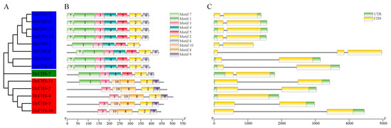 Motifs, gene structures, and phylogenetic relationships of DcCHS family members. (A) Phylogenetic tree of 14 DcCHS proteins generated using Neighbor-Joining (NJ) method. (B) Conserved motifs of DcCHS proteins. (C) Exon/intron structures of DcCHS genes. UTR(s), exon(s), and intron(s) are indicated with green boxes, yellow boxes, and black lines, respectively.