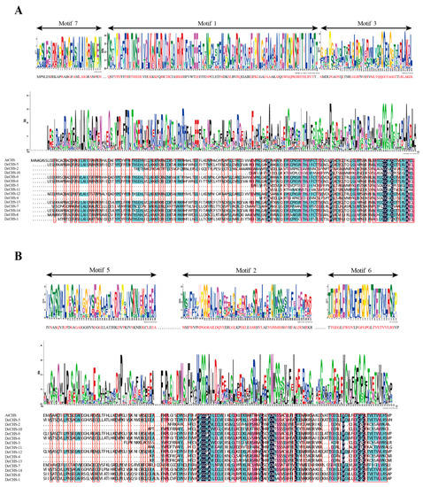 Alignments of the conserved domains of DcCHS proteins. (A) Alignments of the Chal_sti_synt_C and Chal_sti_synt_N domains from the MEME results for DcCHS. Motifs 1, 3, and 7 formed the putative Chal_sti_synt_N domain; motifs 2, 5, and 6 formed the putative Chal_sti_synt_C domain. (B) Alignment of the conserved domains of CHS proteins from A. thaliana and D. catenatum. The conserved amino acids are shown in the red box.