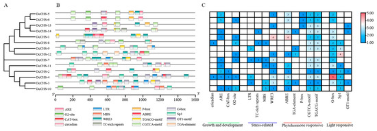 Analysis of cis-elements in the DcCHS genes’ promoter regions. (A) Phylogenetic tree of 14 DcCHS proteins was generated using the NJ method. (B) Different types of cis-elements and their locations in each DcCHS gene are indicated by different colored blocks. (C) Numbers of different promoter elements in the DcCHS genes indicated by different numbers and colors in the grid. The number of cis-elements varies from few (blue) to many (red).