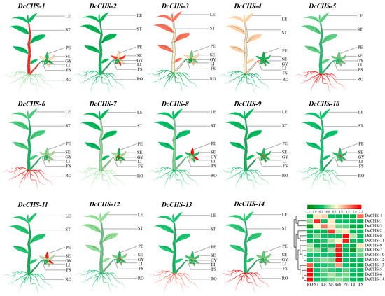 Information on gene expression patterns is very important, as genes with similar expression patterns might have similar characteristics, share similar regulatory genes, and/or have the same origin [51,52]. The DcCHS genes could be classified into four clusters based on their spatial expression patterns. The first cluster was mainly expressed in roots and included DcCHS-5, -6, -13, and -14, which all belonged to Group 3 (Figure 2) and had a high degree of sequence similarity. The second cluster was mainly expressed in gynostemia and included DcCHS-7, -9, -10, -12. The third cluster consisting of DcCHS-2, -8, and -11 was expressed in flower tissues such as sepals or petals. The fourth cluster consisting of DcCHS-1, -3, and -4 was expressed in vegetative organs such as stems or leaves (Figure 6). The different expression patterns in the different organs suggested that the DcCHS proteins might have diverse functions in the regulation of plant organ development.