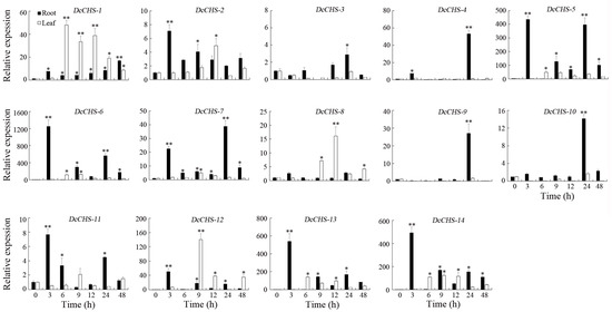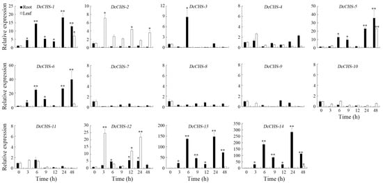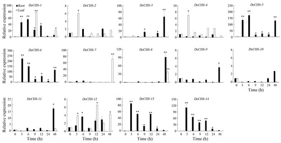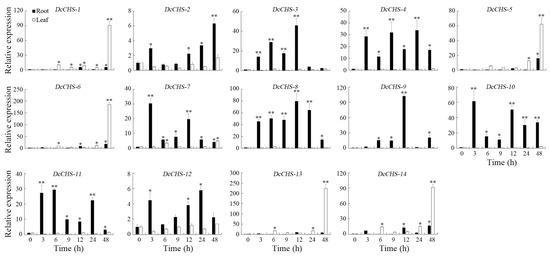 Expression analysis of the DcCHS genes under salt stress using RT-qPCR. The data are expressed as mean ± standard deviation (n = 3). Vertical bars represent means of fold change in expression and standard deviations calculated from replicates. Values of 0, 3, 6, 9, 12, 24, and 48 indicate hours after treatment. Asterisks (* or **) indicate a significant difference at p < 0.05 or 0.01, respectively.