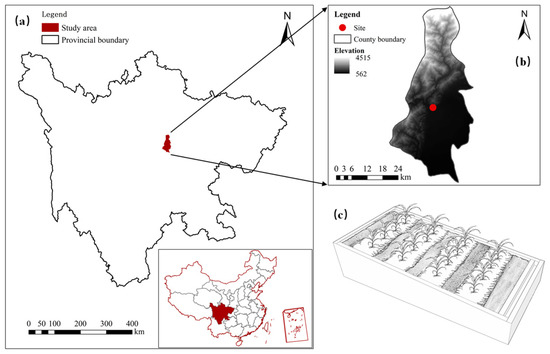 Location of the study area in Sichuan Province: (a) experimental plot in Dujiangyan County (b) and schematic diagram of experimental plot (c).