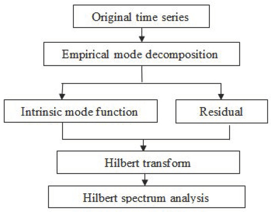 The HHT comprises two parts: EMD and HSA. EMD uses an adaptive dyadic filter bank to decompose input data into several IMFs and extract a residue representing the trend of the original time series. Sifting is completed when the last component is monotonic or constant, as in this case, where no additional IMFs can be extracted [15,19,33]. The flowchart (Figure 2) and equation for the HHT are as follows:
