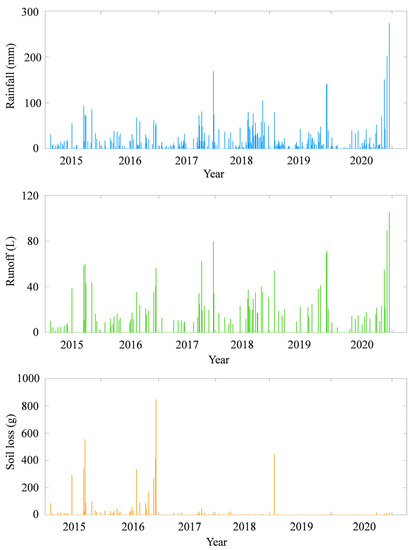 Table 2 presents the statistical characteristics of the original time series of rainfall, runoff, and soil loss. The rainfall ranged from 0 to 273.27 mm, with a mean value of 7.68 mm. The highest rainfall was observed in August 2020 (Figure 3). The coefficient of variation (CV) was 281.77%, indicating that rainfall was strongly temporally variable during the maize-growing seasons from 2015 to 2020. The runoff and soil loss ranged from 0 to 105.42 L and 0 to 847.67 g, and the mean values were 3.15 L and 6.63 g, respectively. The highest values of runoff and soil loss were observed in August 2020 and August 2016, respectively. The CVs of the runoff and soil loss, at 339.76% and 739.61%, respectively, indicated that both the runoff and soil loss showed considerable temporal variation during the different maize-growing seasons in 2015–2020. The strong temporal variations were probably caused by the impacts of rainfall and agricultural land use.