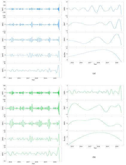 - Huang, N.E.; Shen, Z.; Long, S.R.; Wu, M.C.; Shih, H.H.; Zheng, Q.; Yen, N.C.; Tung, C.C.; Liu, H.H. The empirical mode decomposition and the Hilbert spectrum for nonlinear and non-stationary time series analysis. Proc. Roy. Soc. A Math. Phys. Eng. Sci. 1998, 454, 903–995. [Google Scholar] [CrossRef]