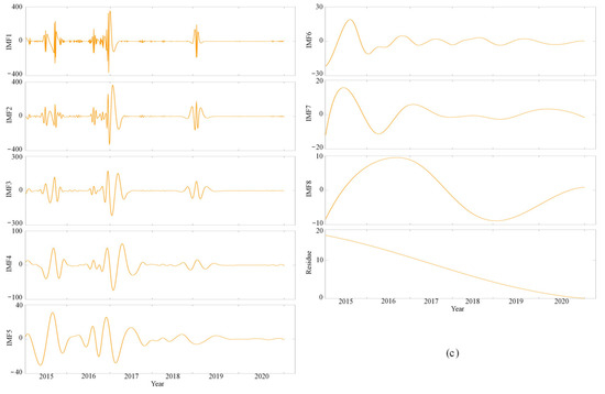 Intrinsic mode functions (IMF) and residues of rainfall (a), runoff (b), and soil loss (c) during the maize-growing seasons from 2015 to 2020 determined by EEMD.