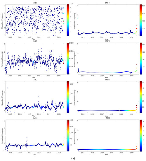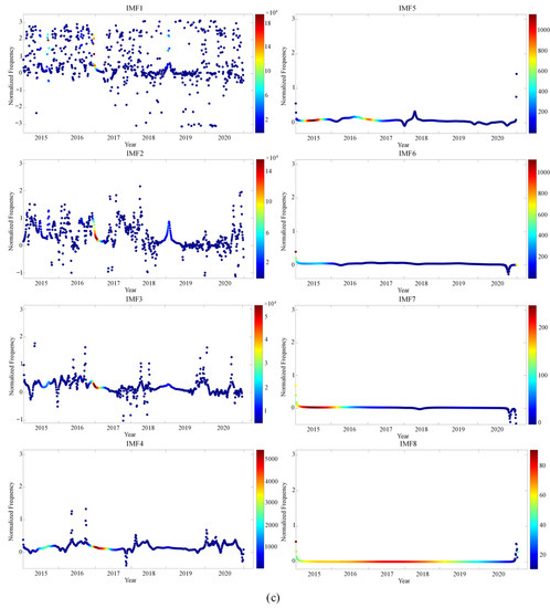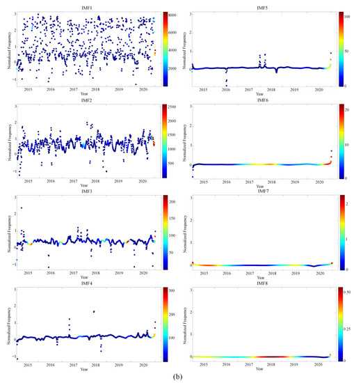The second part is of the HHF is the HSA. The instantaneous frequency of each IMF is obtained by the Hilbert transform [19], and then the Hilbert spectrum (H (θ, t)) can be plotted based on Equation (2) [15]. The Hilbert spectrum can visualize the distribution of the signal amplitude through time and frequency [36], revealing additional properties of the original time series.