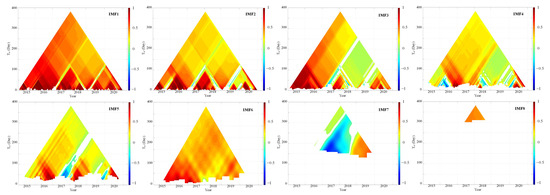Figure 7 shows the TDIC between the soil loss and runoff at different temporal scales. A long-range positive correlation is observed in the entire time domain, i.e., not only at short time scales (IMF1, IMF2) but also at long-term scales (IMF6, IMF8). This suggests that the runoff shows stronger impacts and better consistency with the fluctuations of the soil loss at multiple time scales relative to the case with rainfall. Liu et al. (2019) [12] showed a similar result, i.e., that runoff was more strongly correlated with the SSC than with rainfall. IMF7 exhibits a distinct switchover from a negative correlation to a positive correlation during 2018–2019. This result may be related to extreme soil erosion events in April 2019. High heterogeneity is visible in the correlations at the IMF3, IMF4, and IMF5 scales. However, these transformations of the correlations may be owing to uncertain physical processes, such as local microclimates and human intervention [50]. The exact reasons require further investigation in the future. Overall, the TDIC breaks the notion of uniqueness regarding the nature of the association between soil loss, rainfall, and runoff; the relationship varies in time scale and time domain [18]. Based on the TDIC, we can conclude that at some scales, rainfall and runoff are likely not as influential on the soil loss process as at other scales. Therefore, using the TDIC technique to identify such low influential modes at multiple scales and excluding them may eventually improve soil loss prediction performance [12,50].