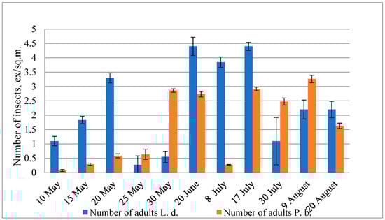 In 2015, the first individuals of P. bioculatus appeared in the second 10 days of May, at the end of which its abundance was 0.1 ind./m2 and gradually began to increase (Figure 5). In June, the population density of the predator was high and amounted to 2.8 ind./m2. However, in the first 10 days of July, the number of the entomophages began to decrease, as the CPB number dropped.