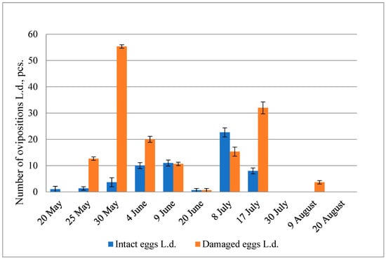 Favorable wintering conditions for P. bioculatus in 2015 (early and warm spring) made it possible to synchronize the development cycles of the predator and the CPB. Thus, the biological efficiency of the natural regulation of the pest population in the experimental plots reached 95–99%. It was found that out of 54 ovipositions recorded, only one was not destroyed by the predator (98% efficiency) (Figure 7). Thus, the earliest CPB development stage (the egg stage) was suppressed, and the harmful larval stage was prevented.