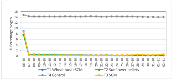 Soil oxygen percentages during the autumn biosolarization season. SCM: Semi-composted manure.
