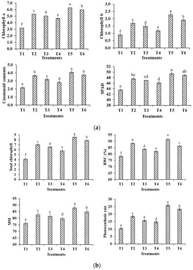 The application of reduced doses of NPK in combination with the two types of vermicompost significantly (p < 0.05) enhanced the physiological attributes of tomato plants. The maximum chlorophyll a, b, carotenoid and chlorophyll (SPAD) readings were found to be 6.3 ± 0.02 mg g−1, 2.27 ± 0.11 mg g−1, 4.08 ± 0.43 mg g−1, and 49.41 ± 3.21 in T5, with 96%, 155%, 89%, and 13.5% increases over their respective controls (Figure 1a). Total chlorophyll contents were recorded as maximum (8.5 ± 0.36 mg g−1) in T5, with a 109% increase over the control treatment. The same treatment showed the highest response of relative water content (RWC), membrane stability index (MSI), and photosynthesis was also found to be maximum in T5, with maximum values of 91.4 ± 0.78%, 88 ± 1.22%, and 26 μmol m−2 s−1 ± 0.77, which was were 17%, 16%, and 150% more than the control treatments, respectively (Figure 1b).