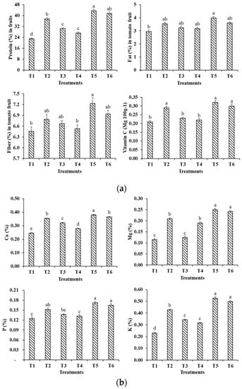 The nutritional and quality attributes of the fruits were also assessed and compared with the mean using ANOVA. It was revealed that the nutritional and quality parameters of the fruits were positively affected by the applied treatments. The maximum tomato fruit protein contents (43.47%) and fat and fiber contents were recorded at 43.47% ± 1.17, 4% ± 0.09, and 7.23% ± 0.12 in T5. In the same treatment, Vitamin C contents also show the same response after the T5 treatment application. Vitamin C was found to be 0.32 mg 100 g−1, which was 52% more than the control treatment (Figure 2a). The maximum tomato fruit calcium, magnesium, phosphorus, and potassium contents were found to be 0.380% ± 0.004, 0.250% ± 0.006, 0.172% ± 0.004, and 0.527% ± 0.010 in T5, which were 54%, 117%, 38%, and 128% more than the respective controls, respectively (Figure 2b).