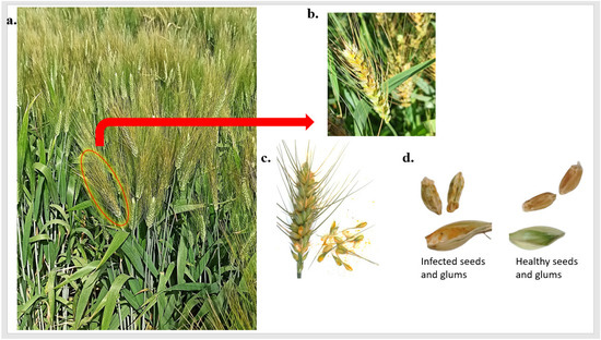 Previously, Pst head infection was known to occur in highly susceptible wheat genotypes and was thought to be an extension of foliar infection. However, recently head infection in highly resistant genotypes was identified in Egypt. These findings mean that genotypes with no Pst foliar infection (PstFI) could have Pst head infection (PstHI) (Figure 1a,b). The infected heads contained many Pst spores inside their floral parts (Figure 1c). Wheat kernels produced from these infected heads were very shriveled compared to the kernels produced from healthy heads harvested at the same time (Figure 1d). Therefore, this phenomenon and comparing it with Pst foliar infection was worth studying to understand more about PstHI and its resistance.