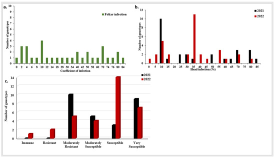 The number of foliar and head resistant genotypes was investigated in both growing seasons. In 2021, three genotypes were found to be resistant to both foliar and head infection, three were resistant to PstHI only, and six genotypes were resistant to PstFI only (Figure S3a). While, in 2022, three genotypes were resistant to both foliar and head infection, five were resistant to PstHI only, and four genotypes were resistant to PstFI only (Figure S3b). The three resistant genotypes to both foliar and head infections were the same in both growing seasons.