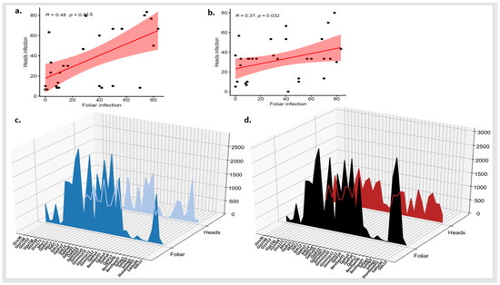 Phenotypic correlations were calculated and visualized using SRPlot online database available at http://www.bioinformatics.com.cn/srplot (accessed on 15 October 2022). Furthermore, the same online database was used to visualize the AUDPC and correlation between head infection (%) and foliar infection (%), a 3D plot and a scatter plot, respectively, using the same online database.