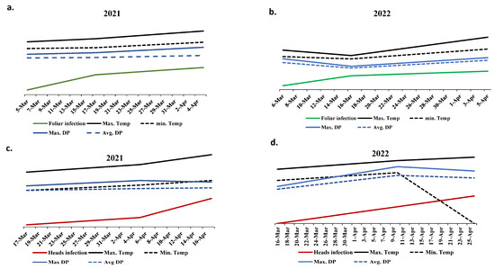 The relationship between the four significant climate factors (℉) and percentage of foliar infection (%) (a,b) as well as head infection (c,d) in the two growing seasons (2021 (a,c) and 2022 (b,d)).