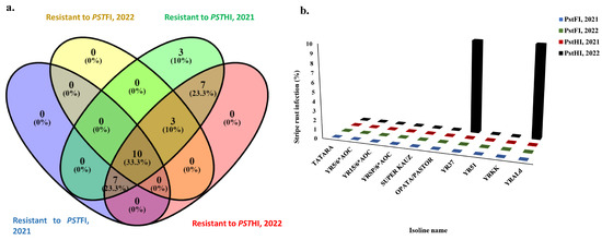 To investigate possible genes that control the resistance to Pst foliar and head infections, a set of 51 isolines that are carrying different Yr-resistant genes were evaluated for two years (Table S2). Out of these isolines, ten were resistant to PstFI and PstHI in both growing seasons (Figure 5a). These ten isolines were found to be immune to PstFI and PstHI, except Yr37 and YrALD which had 10% of infected heads in 2022 (Figure 5b). The remaining eight immune isolines were found to carry Yr5, Yr15, YrSP, Yr51, YrKK, Yr3 (Tartara), Yr18 (Super Kauz), and Yr18 and Yr31 for OPATA/PASTOR (Figure 5b). Moreover, three and seven isolines were resistant to PstHI in both years as well as PstFI in at least one growing season (2021 or 2022). Out of the 51 isolines that carried different Yr genes, 17 and 13 genes were resistant to PstFI in 2021 and 2022, respectively. Furthermore, 30 and 27 genes were resistant to PstHI in 2021 and 2022, respectively (Table S2 and Figure 5a).