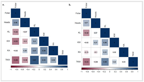 Correlation between kernel traits (kernel length (KL), kernel width (KW), kernel area (KA), and thousand kernel weight (TKW)) and stripe rust foliar and head infection in 2021 (a) and 2022 (b) growing seasons.