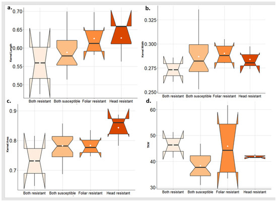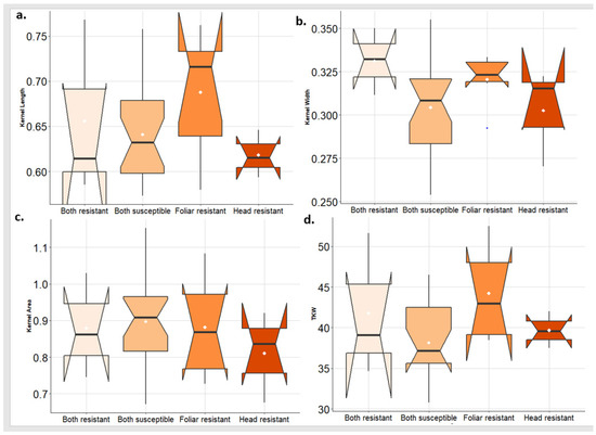 Comparison of the kernel traits (kernel length (KL) (a), kernel width (KW) (b), kernel area (KA) (c), and thousand kernel weight (TKW) (d)) in the genotypes that are resistant to foliar and head infection, resistant to foliar infection only, resistant to head infection only, and susceptible to both symptoms in 2022 growing season.