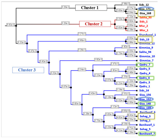 To genetically investigate the possibility of improving Pst resistance in the Egyptian wheat germplasm using these genotypes as parents, the genetic distance among all the tested genotypes was calculated and represented in Table S4 and Figure 9. The genotypes are grouped into three clusters with three, four, and 24 genotypes in cluster1, cluster2, and cluster3, respectively. Out of the three selected genotypes that are resistant to both PstFI and PstHI, two genotypes, Sids-13 and Sohag-3, were located in cluster 3 with a genetic distance of 0.47. While the third superior genotype Giza-168 was located in cluster 1 and was separated from Sids-13 and Sohag-3 with a distance of 0.34 and 0.49, respectively (Table S4). The three genotypes that were resistant only to PstHI were located in the same clusters (cluster 1 and 3) as the group of genotypes that are resistant to both symptoms. The four genotypes that are resistant only to PstFI were clustered in cluster 3. The greatest genetic distance among the four PstFI-resistant genotypes and PstHI-resistant genotypes was found between BeniSweif-7 and Giza_171 with a distance of 0.489, while the greatest distance between these four genotypes and genotypes resistant to both PstFI and PstHI was 0.497 between BeniSweif-7 and Giza_168. Notably, all genotypes that were located in cluster 2 were found to be susceptible to both PstFI and PstHI.