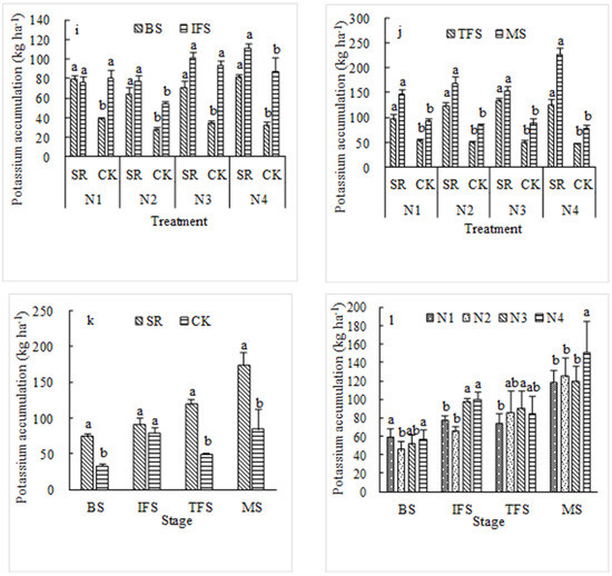 The effects of annual straw return combined with application of nitrogen fertilizer in rice season on nutrient accumulation in subsequent rape (kg ha−1). SR represents straw returning to the field, and CK represents straw leaving the field. BS: bolting stage; IFS: initial flowering stage; TFS: terminal flowering stage; MS: mature stage. Different lowercase letters indicate significant differences at the 5% level between different straw treatments or between same straw treatments under the same nitrogen application. (a,b) represent the amount of nitrogen accumulated over each period of BS, IFS, TFS, and MS, respectively. (c) shows the difference in nitrogen accumulation at different period under straw treatment. (d) shows the difference in nitrogen accumulation under different nitrogen application treatments at different period. (e,f) represent the amount of phosphorus accumulated over each period of BS, IFS, TFS, and MS, respectively. (g) shows the difference in phosphorus accumulation at different period under straw treatment. (h) shows the difference in phosphorus accumulation under different nitrogen application treatments at different period. (i,j) represent the amount of potassium accumulated over each period of BS, IFS, TFS, and MS, respectively. (k) shows the difference in potassium accumulation at different period under straw treatment. (l) shows the difference in potassium accumulation under different nitrogen application treatments at different period.