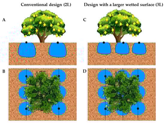 Citrus are mostly cultivated using localised irrigation, which implies that the wetted soil does not cover the ground in full and permits a reduction in evaporation from the soil, increasing water use efficiency [11]. The volume of wetted soil has an important influence on tree response even when trees are supplied with adequate water; thus, implications for the design and operation of drip irrigation systems would be highly relevant [10]. In adult citrus trees, it is recommended to wet around 40–50% of the ground to ensure an adequate development of the crop [12]. The dimensions of the wetted bulb are related to the number of emitters per plant, the location where most of the roots are concentrated, and the fact that the latter presents an adequate development due to a high frequency of irrigation, allowing them to satisfy the requirements of the aerial part of the tree [13]. In the cultivation of citrus in Spain, between four and six emitters per tree are used in a 6 × 4 m tree-spacing [12]. In addition, the number of emitters per tree in drip irrigation can be determined depending on the age of the tree and the texture of the soil in the case of not having field tests [14]. Generally speaking, a single drip line is recommended per row of trees, but in practice the best results (both in terms of production and quality) are achieved with two drip lines per row of trees [12]. The use of two drip lines allows for a more even distribution of roots, but implies a greater investment [15]. Previous studies carried out by our group at the same experimental orchard showed that, in well-irrigated trees, the use of two drip lines in ‘Fino 49′ lemon trees allowed for the maintenance of a better plant water status (Ψstem ≈ −1.2 MPa) [16] than in those cases in which ‘Verna’ lemon trees were irrigated with a single drip line (Ψstem ≈ −1.5 MPa) [17] during high-demand periods. On the other hand, [18] compared the use of two drip lines versus one drip line per row in ‘Fino 95 lemon’, specifying that plant water status had not been altered and that both agronomic designs maintained a similar production when they was carried out in a single harvest.