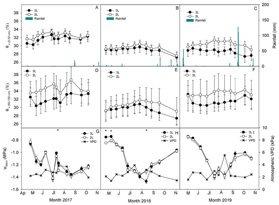 Seasonal evolution of rain and volumetric soil water content (θv) in the soil profile (0–50 cm) (A–C), volumetric soil water content (θv) in the soil profile (60–100 cm) (D–F), and midday stem water potential (Ψstem) with values of the air vapour pressure deficit VPD (G–I) for each irrigation system (two lines [2L] and three lines [3L]) during the experimental period (2017 to 2019). Each point is the average of 8 measurements in θv and 12 measurements in Ψstem. Vertical bars indicate ± SE. * indicates p < 0.05.